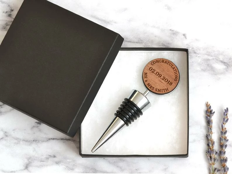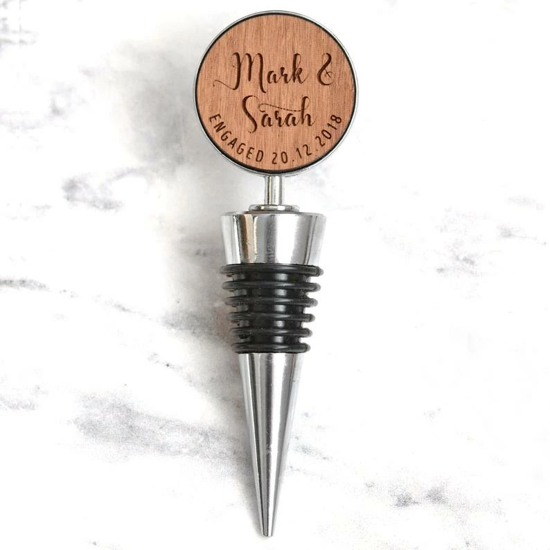 A beautifully custom engraved wine bottle stopper, with a personalised wooden insert. A perfect engagement, wedding, anniversary or housewarming gift. Customise the design with names, initials, a short message or date to create a truly one-of-a-kind gift.