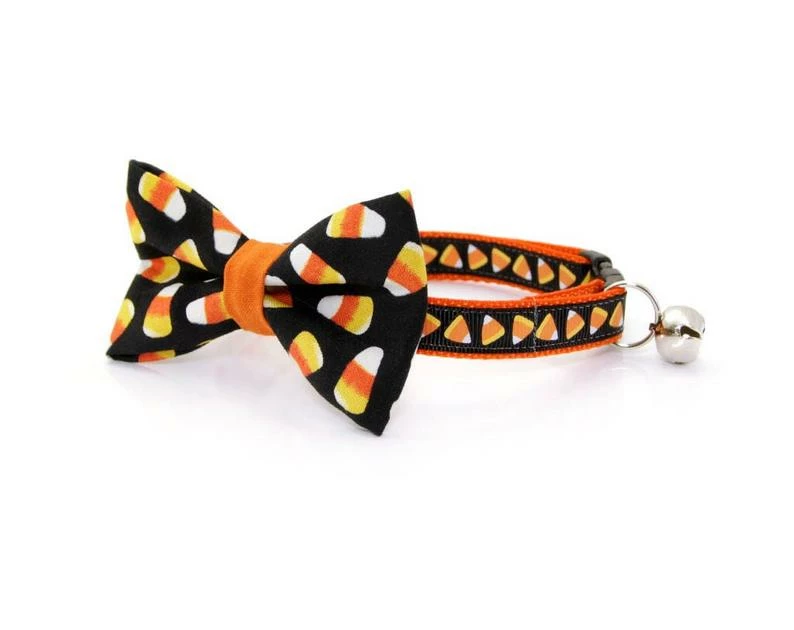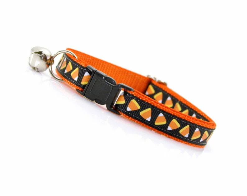 This festive Halloween pet collar with delicious-looking candy corns is available with a safety breakaway OR non-breakaway durable plastic clasp (both look exactly as you see in the photos). Available in multiple sizes for cats, kittens + small dogs. The matching accessories and any other coordinating products shown in the supplemental product photos are also available for purchase in our shop (sold separately – see links below). Note: The pumpkin bell is not included but can be purchased as well (at the link below for charms & bells).