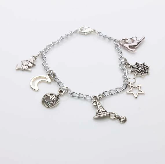 Hand crafted Charm Bracelet made with Silver plated chain and tibetan silver moon, star, pumpkin, spider, witch, cat and witches hat charms.