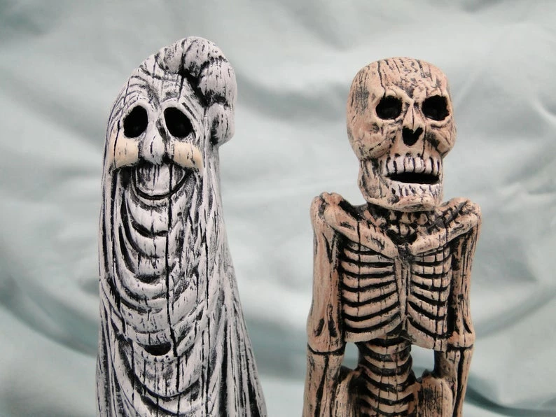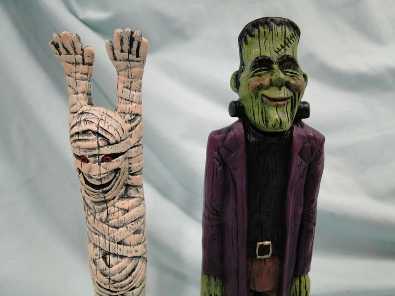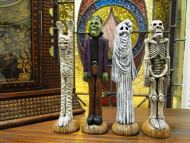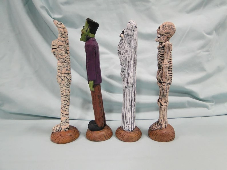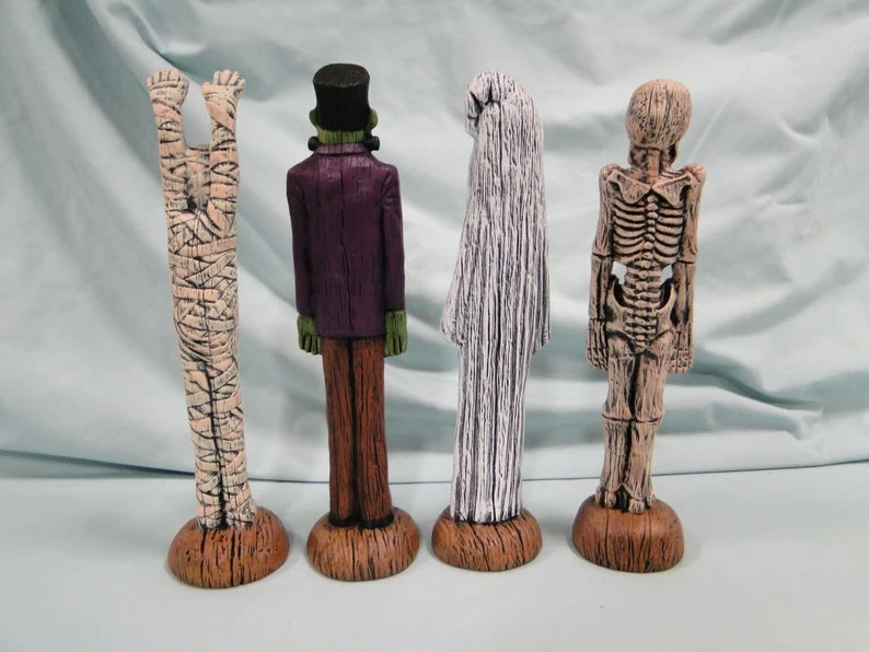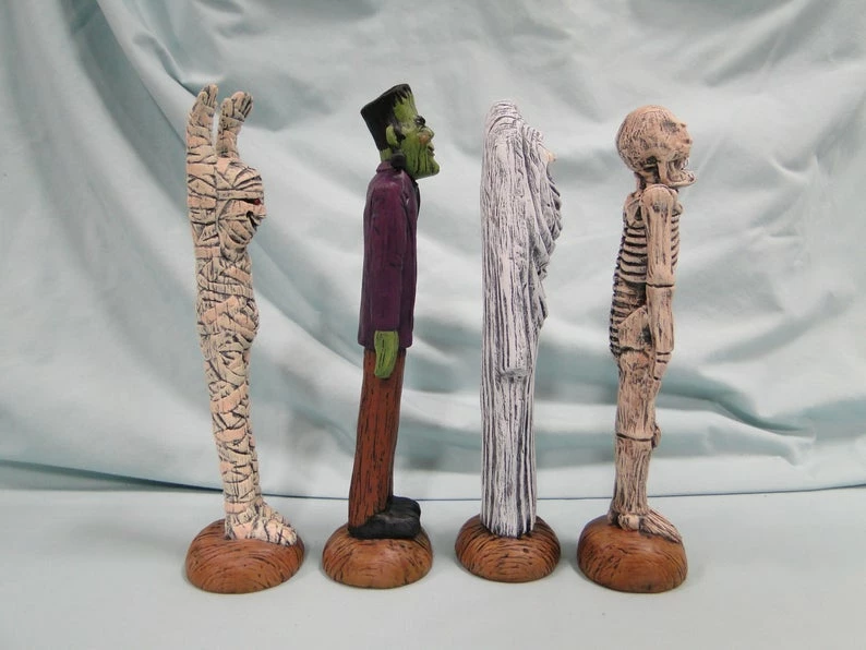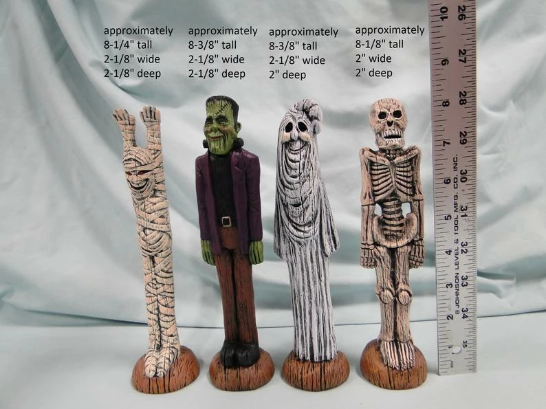Purchaser will receive the exact item in the pictures and not a duplicate or look-a-like. Cast by me from an original vintage mold. Skeleton stands approximately 8-1/8 inches tall, 2 inches wide, and 2 inches deep. Mummy stands approximately 8-1/4 inches tall, 2-1/8 inches wide, and 2-1/8 inches deep. Frankenstein stands approximately 8-3/8 inches tall, 2-1/8 inches wide, and 2-1/8 inches deep. The ghost stands approximately 8-3/8 inches tall, 2-1/8 inches wide, and 2 inches deep. Item also has a matte sealer to protect the antique and dry brush painting technique making it keepsake for future generations to cherish. Item may be cleaned by wiping with a lightly dampened cloth.