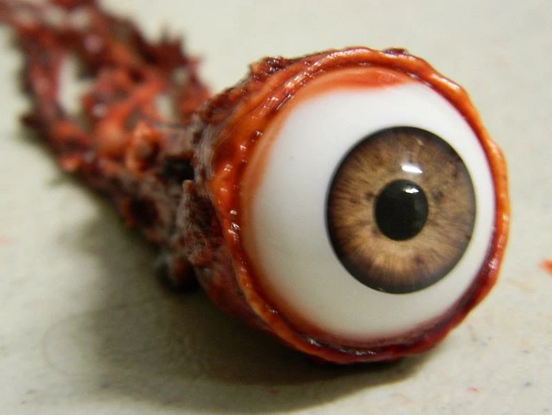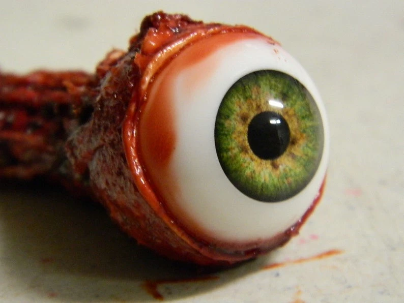 This is a new Ripped out Eyeball. Made of latex with Premium Acrylic realistic eye. Lay this in a pool of fake blood and you have a very realistic prop. Made by Dead Head Props. Quality! Available in 4 different eyeball colors. We custom make each eye, so please allow 3-5 days before shipping.