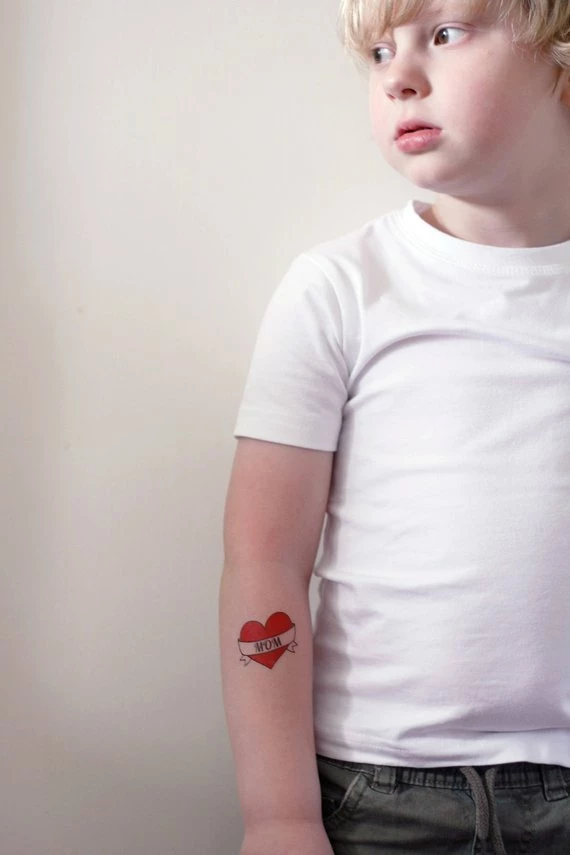 A cute heart with the word ‘mom’ in it. This ‘mom’ tattoo is perfect for your little one on mothers day but also great for a photo shoot!