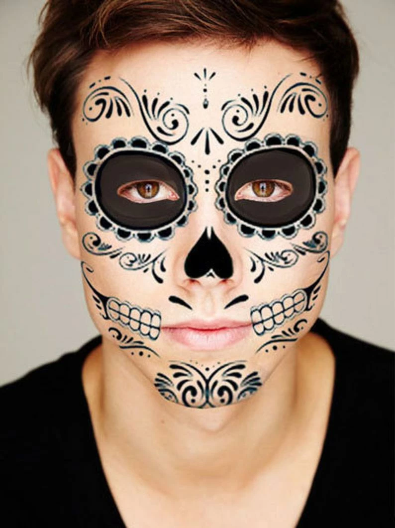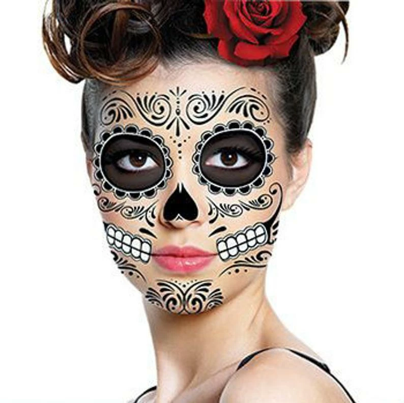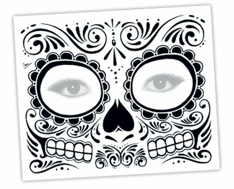 These mask designs work great for men, women, and children. They can be cut and applied to any face size. Cut out the individual shapes and then apply to makeup-free skin with just water and a sponge or cloth making sure to wet the tattoo completely. You will get a durable, vibrant and long-lasting tattoo. Makeup can be applied once the tattoo is dry (within minutes). White face makeup or black makeup for the eyes complete the sugar skull look.