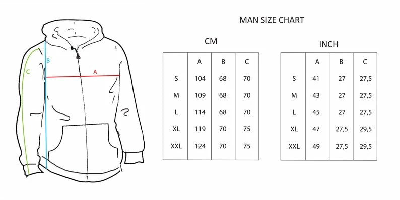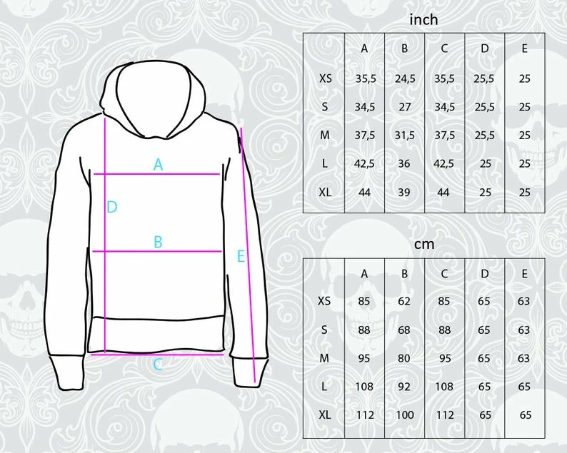 Size chart you can find at the two last photos (first for laddies, second for guys), also I can sew a custom hoodie with your measurements (ask before buy!).