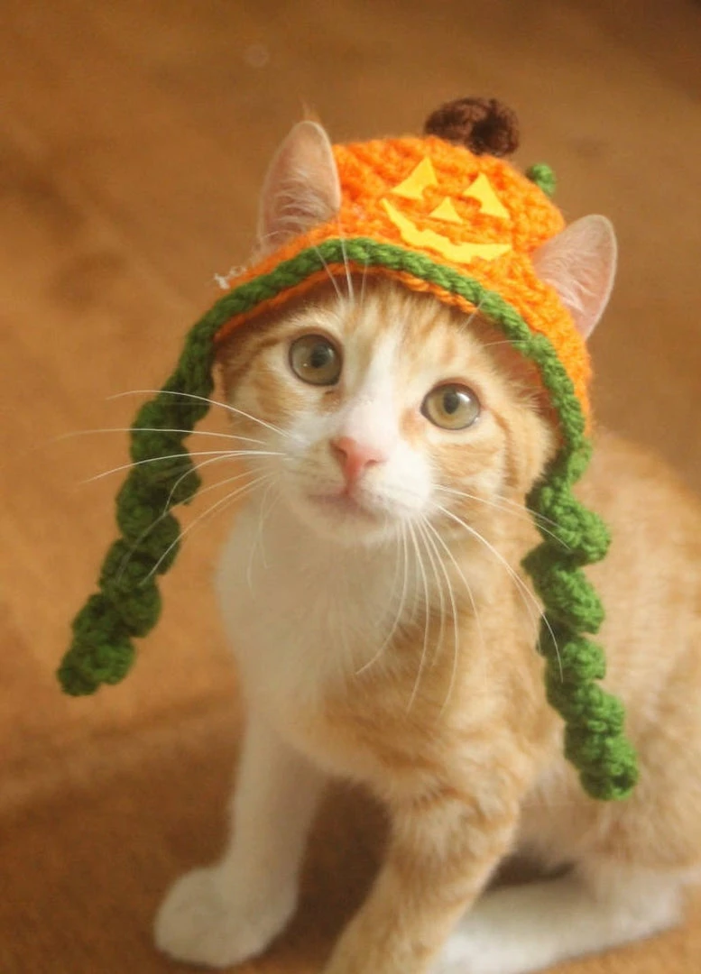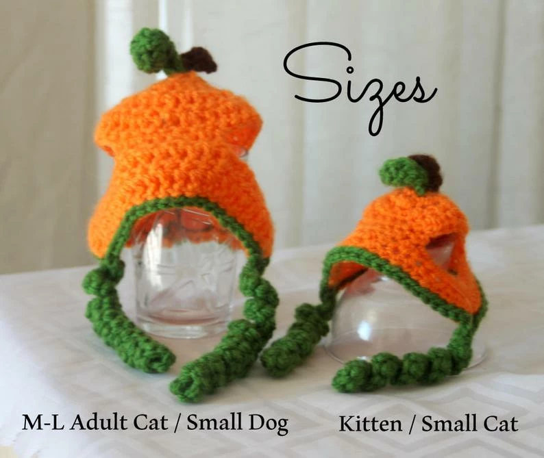 These hats come in sizes perfect to fit your kitten, cat, or small dog. Each hat has a felt Jack-o-lantern face, 2 ear holes, some dangly green “vines,” and a little stem and leaf on top.