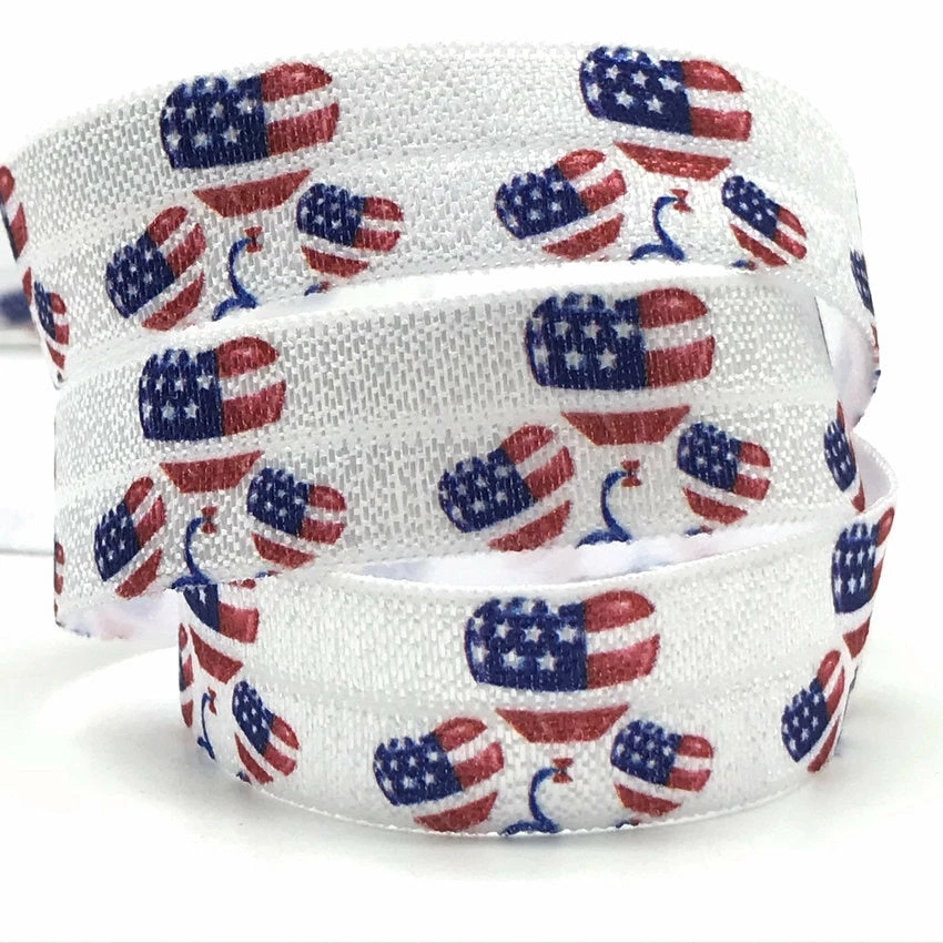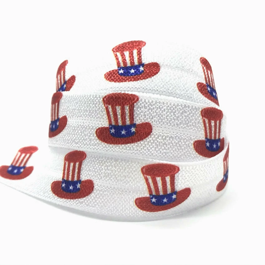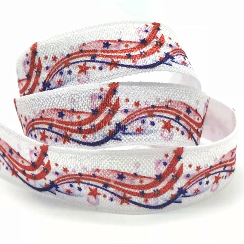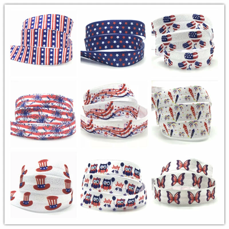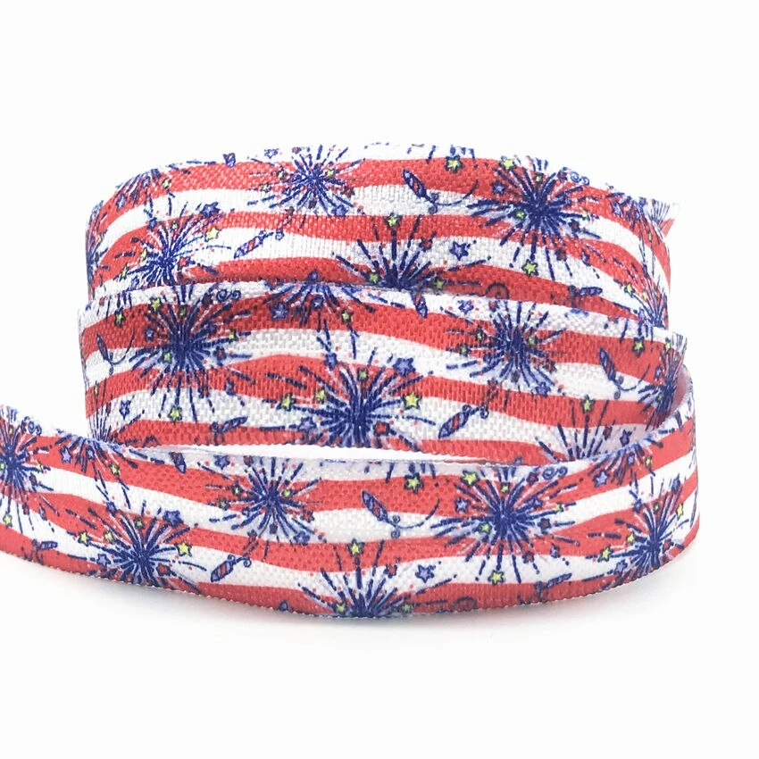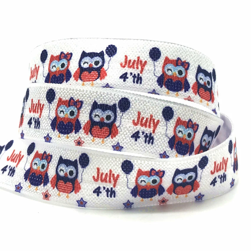 Onlineamericanstore July 4th Fireworks Owl USA Hearts Print Fold Over Elastic FOE Ribbon For Headbands Diy Sewing Decoration Accessories 10yard 15mm