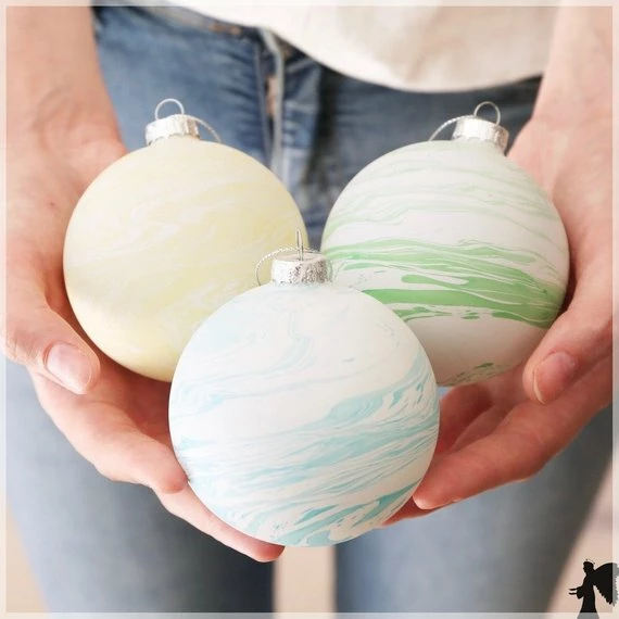 Glass Christmas Bauble, Pastel Orange marble design, hangs from gold ribbon , great alternative Christmas tree decoration.