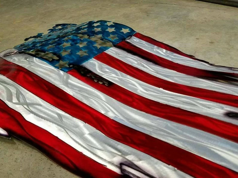 Our Metal American Flag is approximately 26″tall by 46″ wide. Plasma cut, then hand ground to give definition and depth. Once ground, this piece is then rolled by hand to give the dimension of our flag flowing in the wind. After we roll our flag, this symbol of American Patriotism is then airbrushed by hand and finished with a clear powder coat. Powder coating not only seals the airbrushing, but it really brings out the definition created from grinding. Many flags are produced from steel which will eventually rust over time. Aluminum will not rust and with the added protection from powder coating, this American Flag is sure to wow your guests for years to come. Can be purchased in bare aluminum if desired.