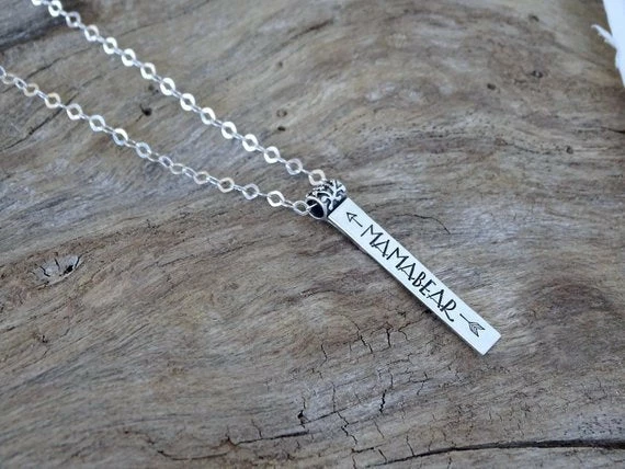 I made this necklace just for me since I have been adoring anything MAMABEAR. You can choose the same or change this personalized vertical name plate to something else. Name plate hangs from a detailed bail and you have the option to choose XXL which is perfect for the long and layered look.