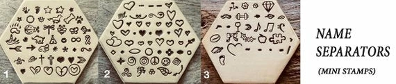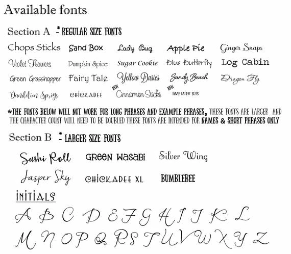 Changes to design must be pre-approved and cost may be effected, Any change to design components is considered a custom request and you must request a custom order. If this is not requested in advance through convos or custom listing request, listing will be made as layout was designed.♥DESIGN STAMPS♥ Please be aware that if you select a design stamp for personalization, depending on size of stamp,the characters allowed for that design can be reduced by as low as 3 characters and up to 50 characters. If the stamp is bigger than a name seperator ( from section A) then you will need pre-approval for these stamps prior to placing order. If pre-approval has not been arranged the I will try to fit what you are requesting if characters allow enough room for design stamp you have selected, but if there is not enough space I will leave this area blank. This is why pre-approval is a must.♥Standard shipping does not have tracking, it is shipped small package air. If you would like your order tracked this option is available at check out for an extra fee.