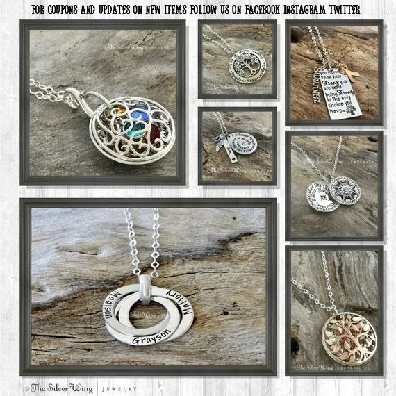 Every piece is finished like Fine Jewelry which makes The Silver Wing very Unique.♥ All of the Hand stamped jewelry at The Silver Wing can be personalized in anyway you wish. You could just add family members or children’s names, or any phrase you choose as long as you under the amount of characters allowed for the design.