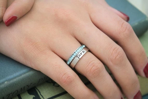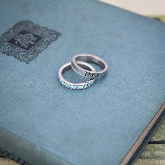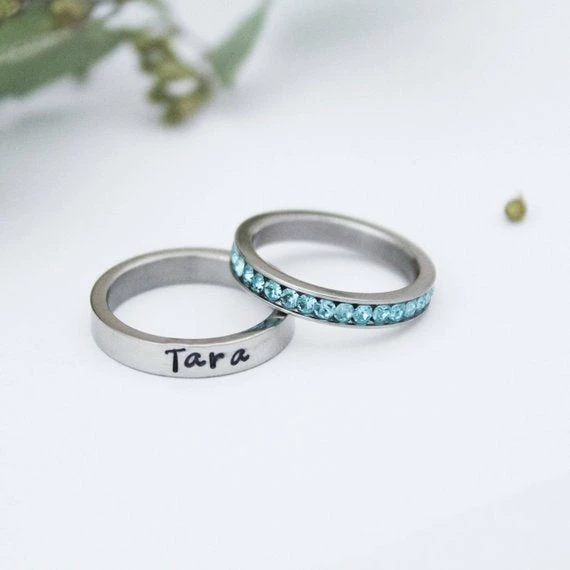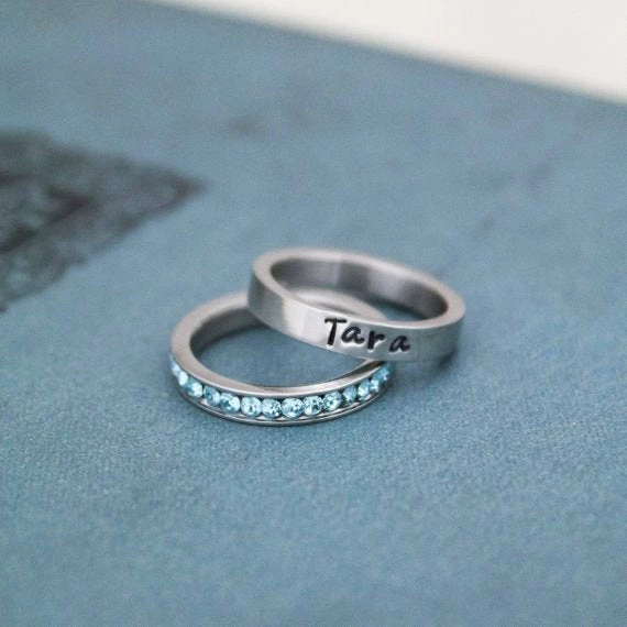Personalized Stacking Birthstone Ring, Customized Silver Ring, Hand Stamped Stainless Steel Name Ring, Silver Personalized Ring