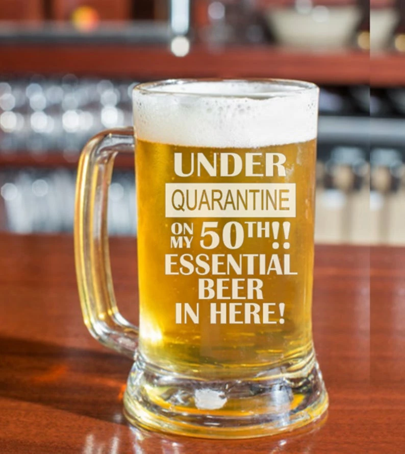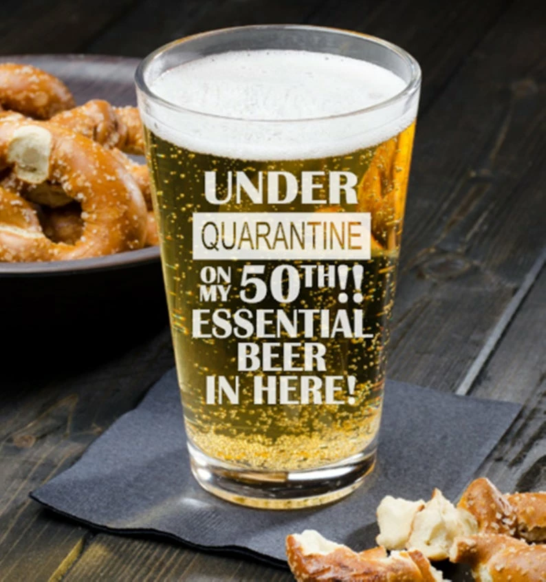 50th Birthday Quarantine etched beer mug or pint glass. The design is sandblasted/etched into the glass, the design will never scratch, chip or fade.