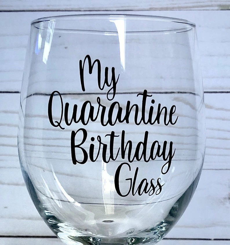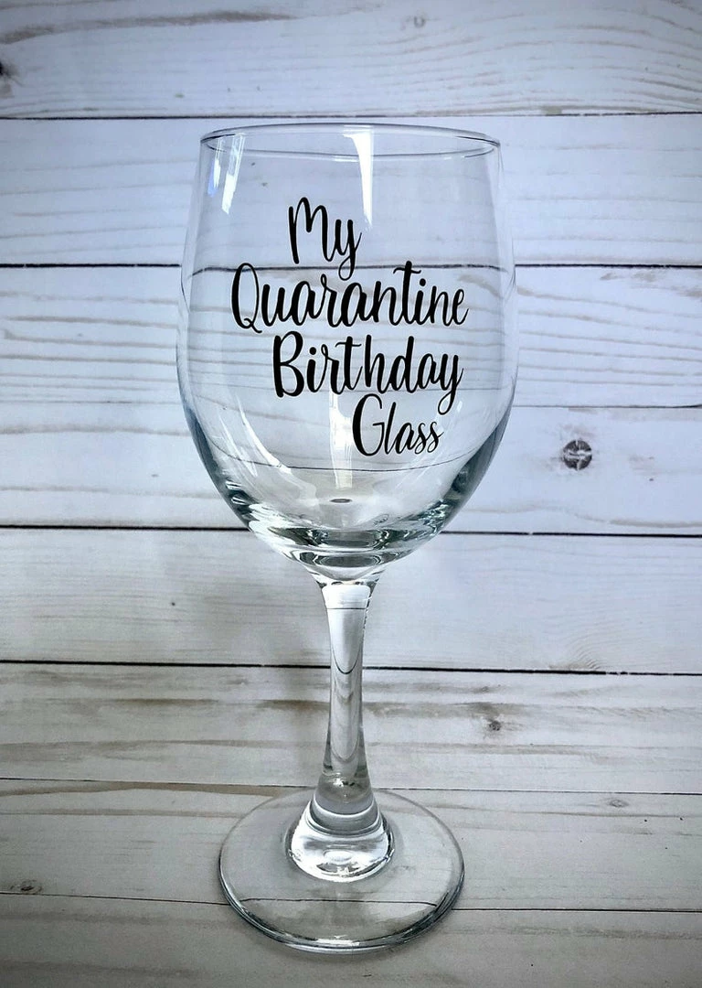 A Quarantine Birthday Gift that everyone will think is funny and love! Vinyl Sticker on a 20 oz wine glass-either stemless or regular can be selected. Hand wash only, do not soak, wash gently.