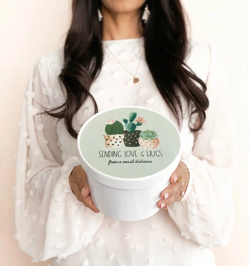 1 round gift box – lid labeled with “Sending Love & Hugs From a Social Distance”
