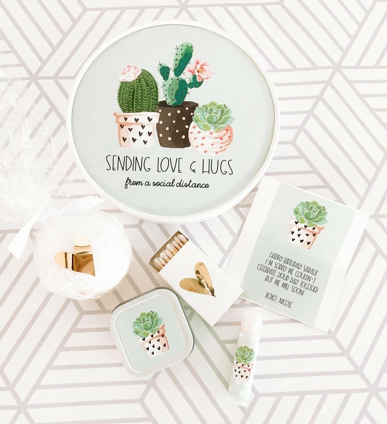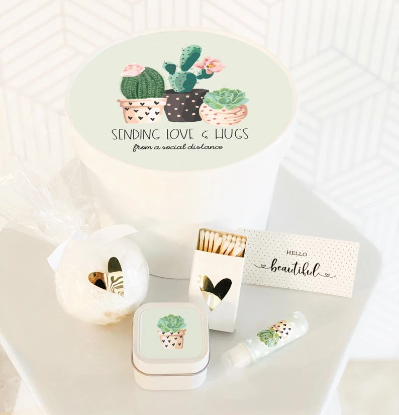 Social Distancing gift boxes make a cute care package to send to friends and family during social distancing – perfect for the birthday girl, mom or any woman. Labeled with “Sending Love & Hugs From a Social Distance” and other gifts inside such as a glitter bath bomb, mini candle, matches & lip balm. Each complete set includes all the items listed below packaged together with white shred in a white round gift box. A mini “hello beautiful” card (printed with your custom message inside!) is included.