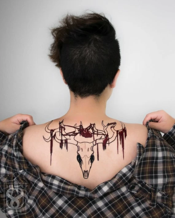 Britt here! This is the second of two tattoos that were planned by Seventh Skin intern Nikki, and we are both immensely proud to have delivered on our goals. I think you’ll agree that this piece is as striking as it is versatile. It will look great on a chest, back, or underbust. (We’re not saying that you need to be a fan of Hannibal to like this tattoo, but it helps!) A big chunk of the proceeds of this tattoo go directly to Nikki. Buy some ink, support a student. It’s a win/win!