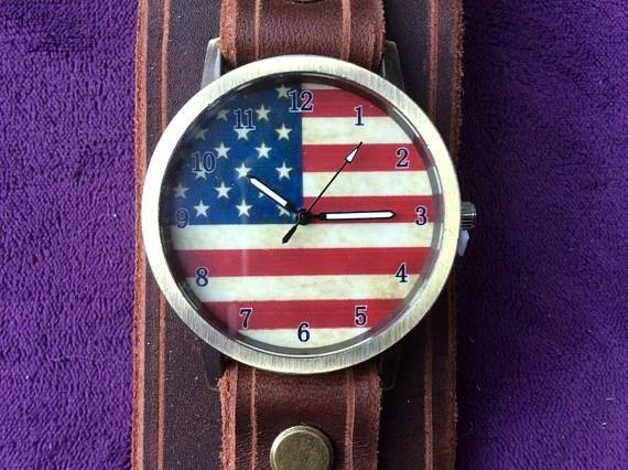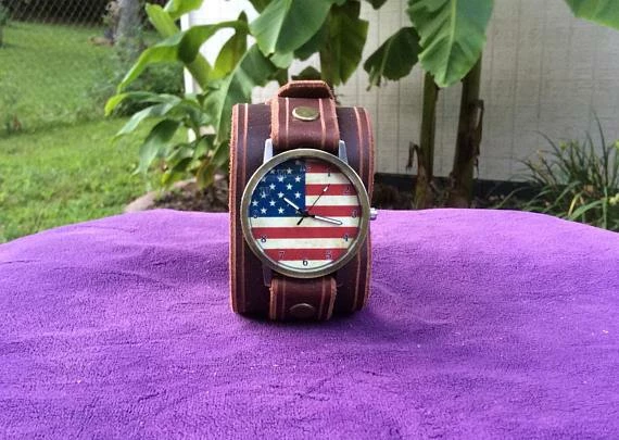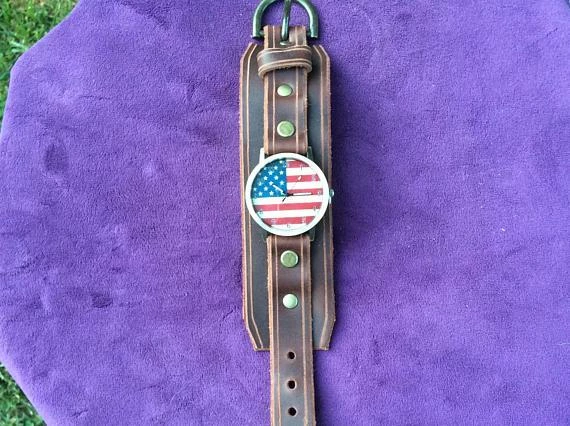 RockinLeather Brown Leather Cuff Watch With American Flag Face And Buckle Accessories