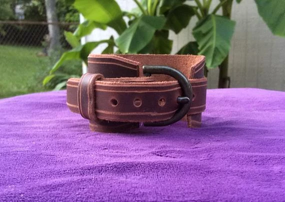 Rich Brown Leather Cuff Watch with a bronze/antique brass watch face, buckle and rivets. The width of this cuff is 1-3/4″ and the diameter will fit wrists measuring approx. 6-1/2″ – 8-1/2″. The face is attached with Chicago screws and allows access for easy battery or watch face change. This is a medium weight leather used. Please check measurements for proper fit and submit wrist measurement so strap can be cut to proper length.
