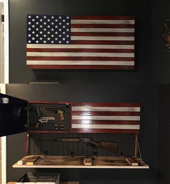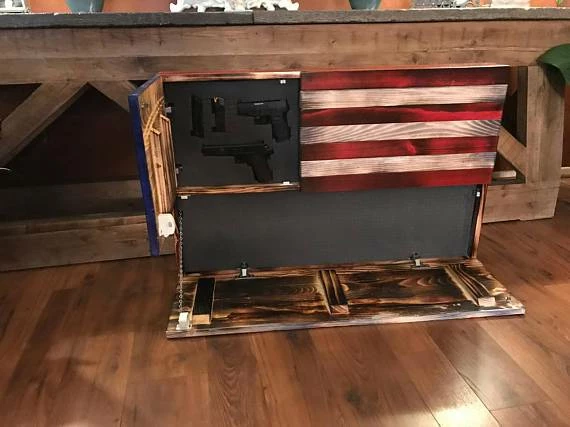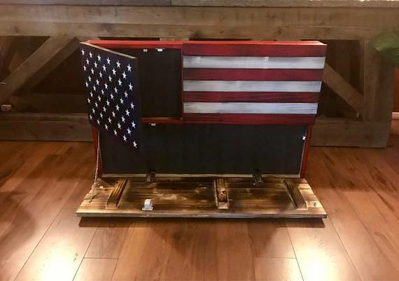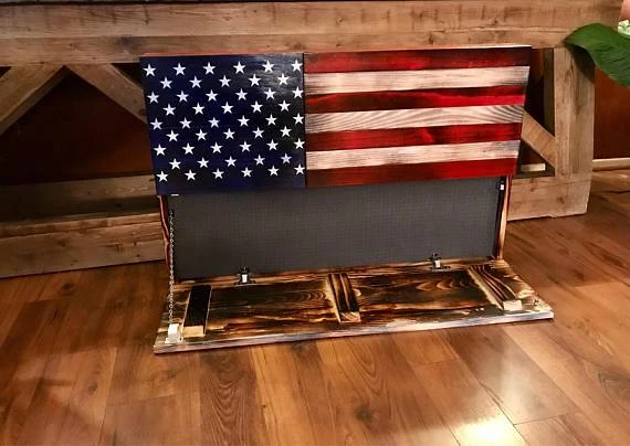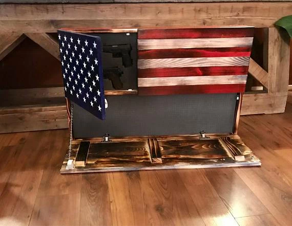 Large Rustic American Flag Concealed Gun Case. The large Bottom opening measures 11″ high and 39″ long. The smaller cabinet is hidden behind the Union of the Flag and measures 12.5″ high and 16″ wide. Both cabinets are held tightly shut with a Safety 1st magnetic child safety lock and one cabinet latch. Your purchase also includes 2″ thick pick and pluck foam for each cabinet, this foam will allow you to securely hold whatever you would like to store.