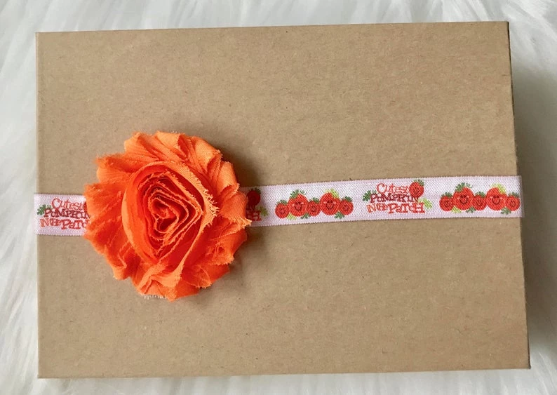 This baby headband features one orange shabby rosette on a “Cutest Pumpkin in the Patch” patterned elastic. The flower measures about 2.5 inches and has a felt backing for added comfort.