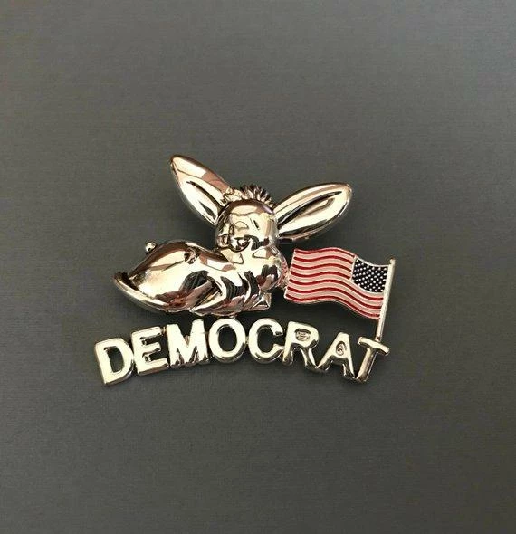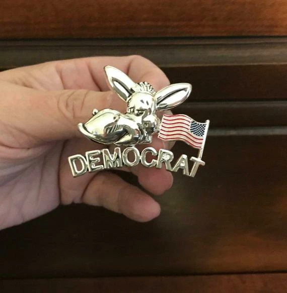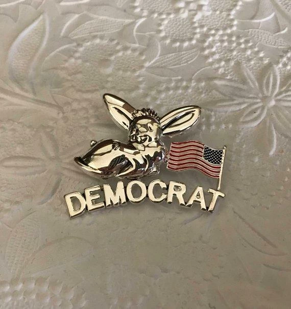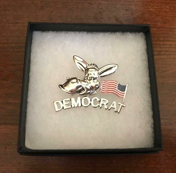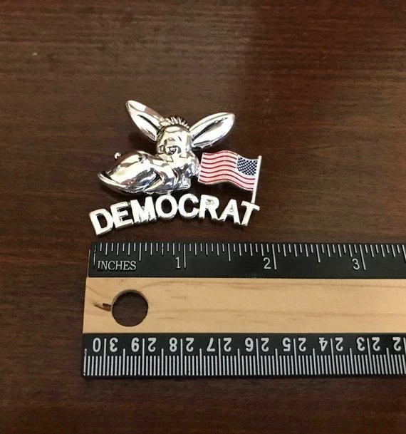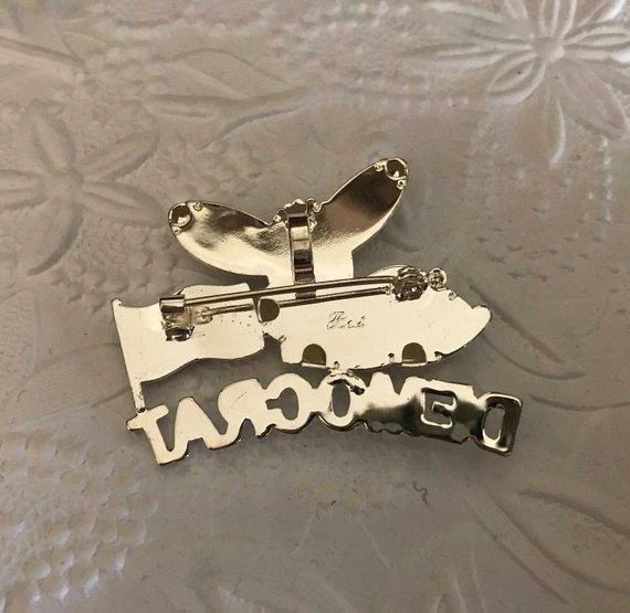 This is a vintage Silvertone Democrat Donkey Pin/Pendant. This Silvertone pin depicts a patriotic donkey with an American flag with enameling. This pin can also be worn on a chain as a pendant. It measures 2 inches by 1 3/4 inches. This pin is signed Best on the back.