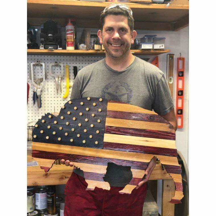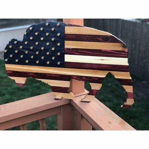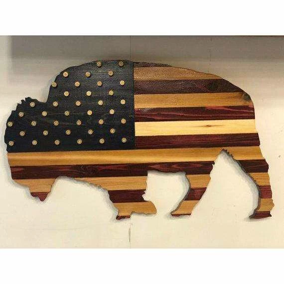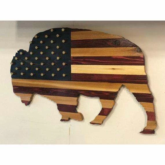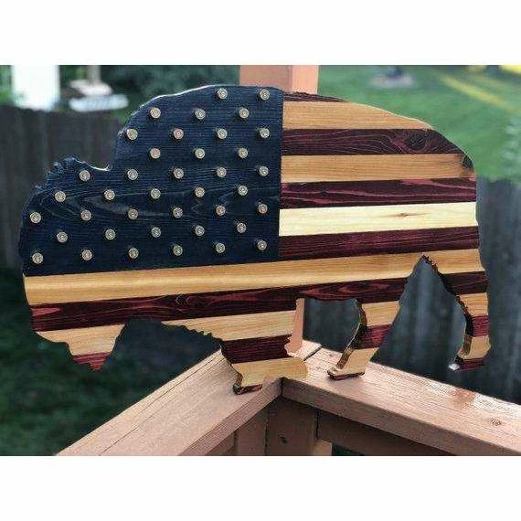 This piece is was inspired by one of my favorite authors, Steven Rinella. His book “American Buffalo” was fantastic, and when doing one of my typical bullet flags I thought of the idea of incorporating the Buffalo, aka Bison, into one of my designs.