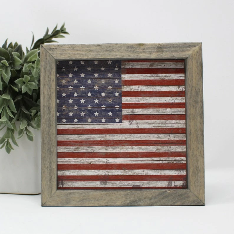 This framed metal USA flag sign will look great in any patriotic setting! Display on a shelf, mantel, or wall anywhere in your home!