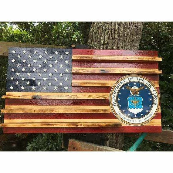 The red stripes are stained and lightly scorched while the other stripes are lightly scorched to give it a distressed look.
