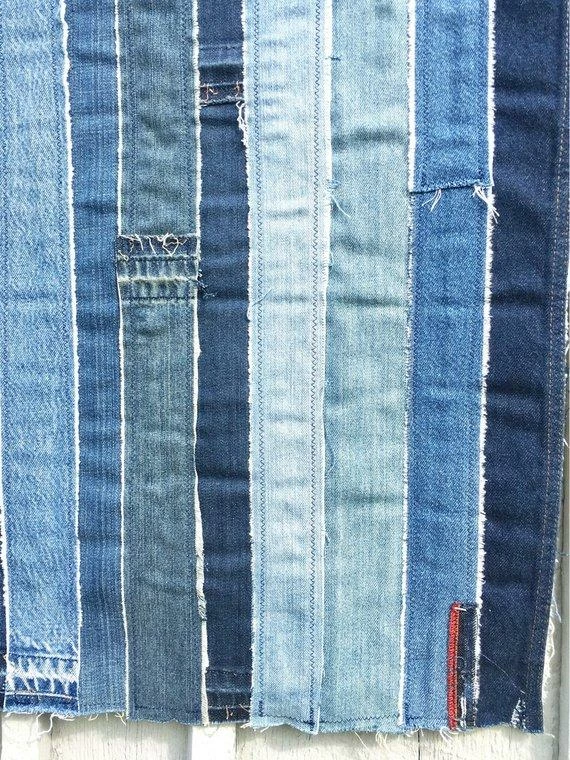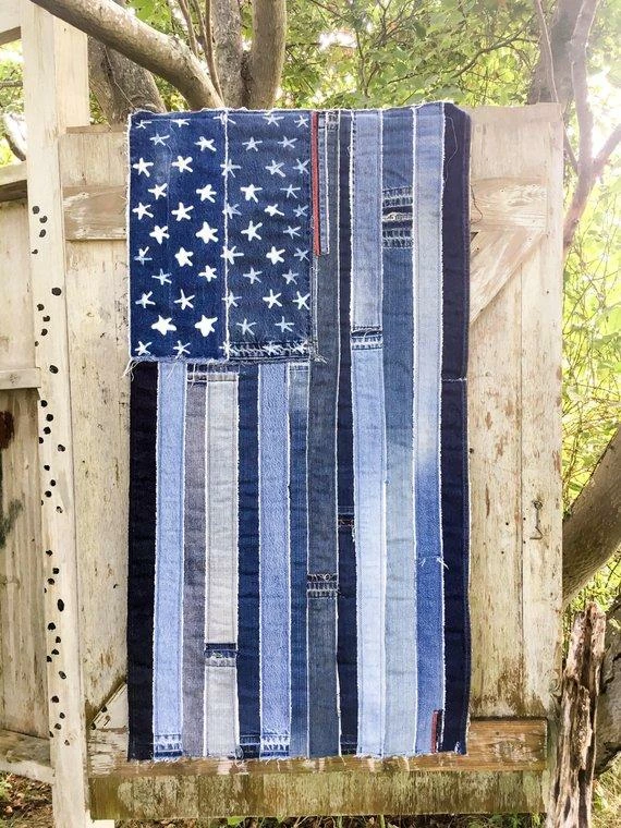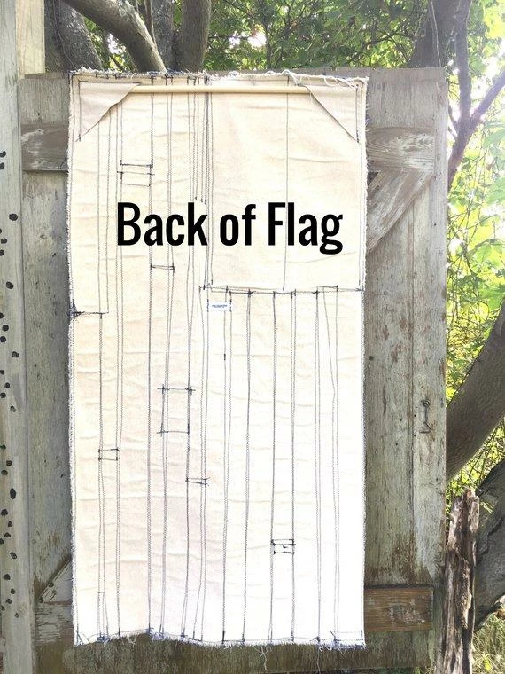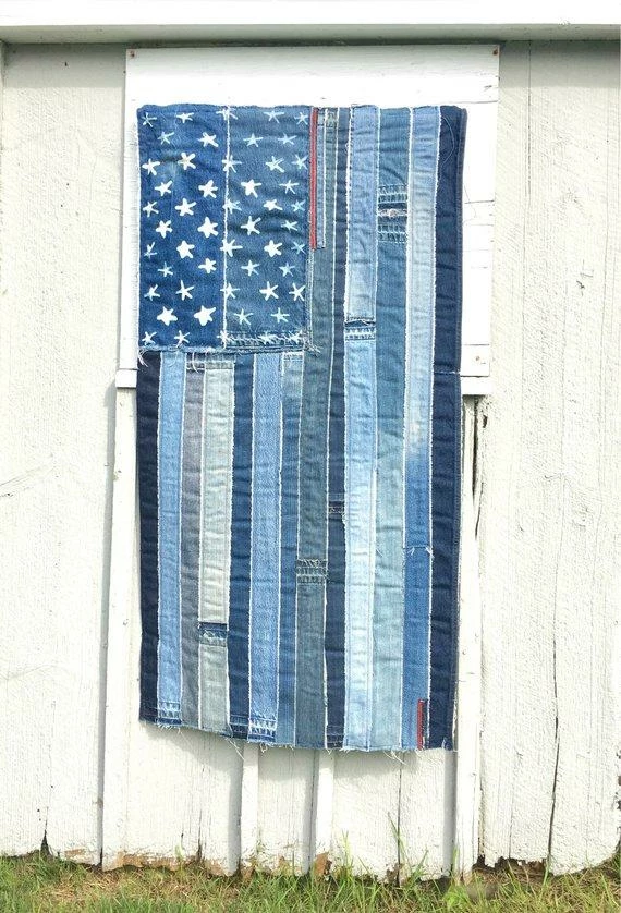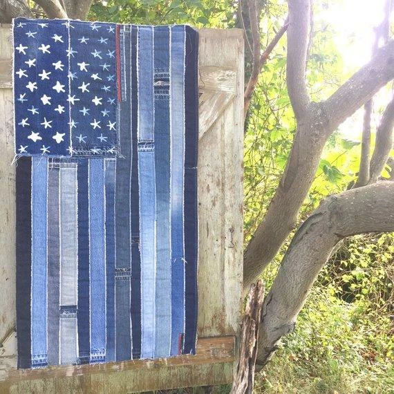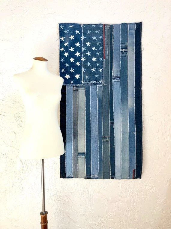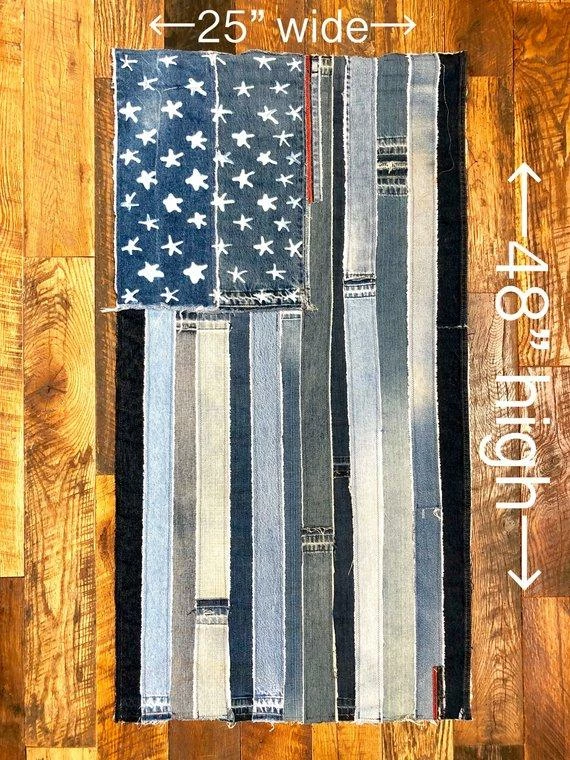 The flag is created from a myriad of denim in light and dark colors. Each flag is one-of-a-kind. The denim edges have raw seams and hanging threads for a handmade vintage look.