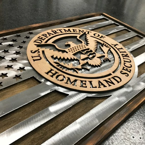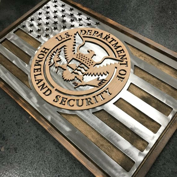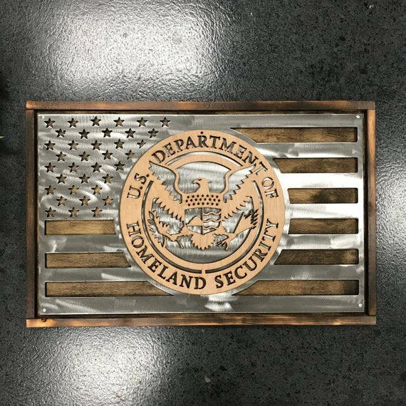 Laser cut wood sign with floating 14 gauge metal flag backing.