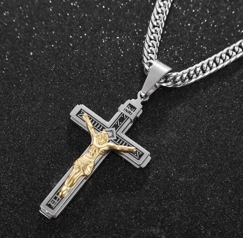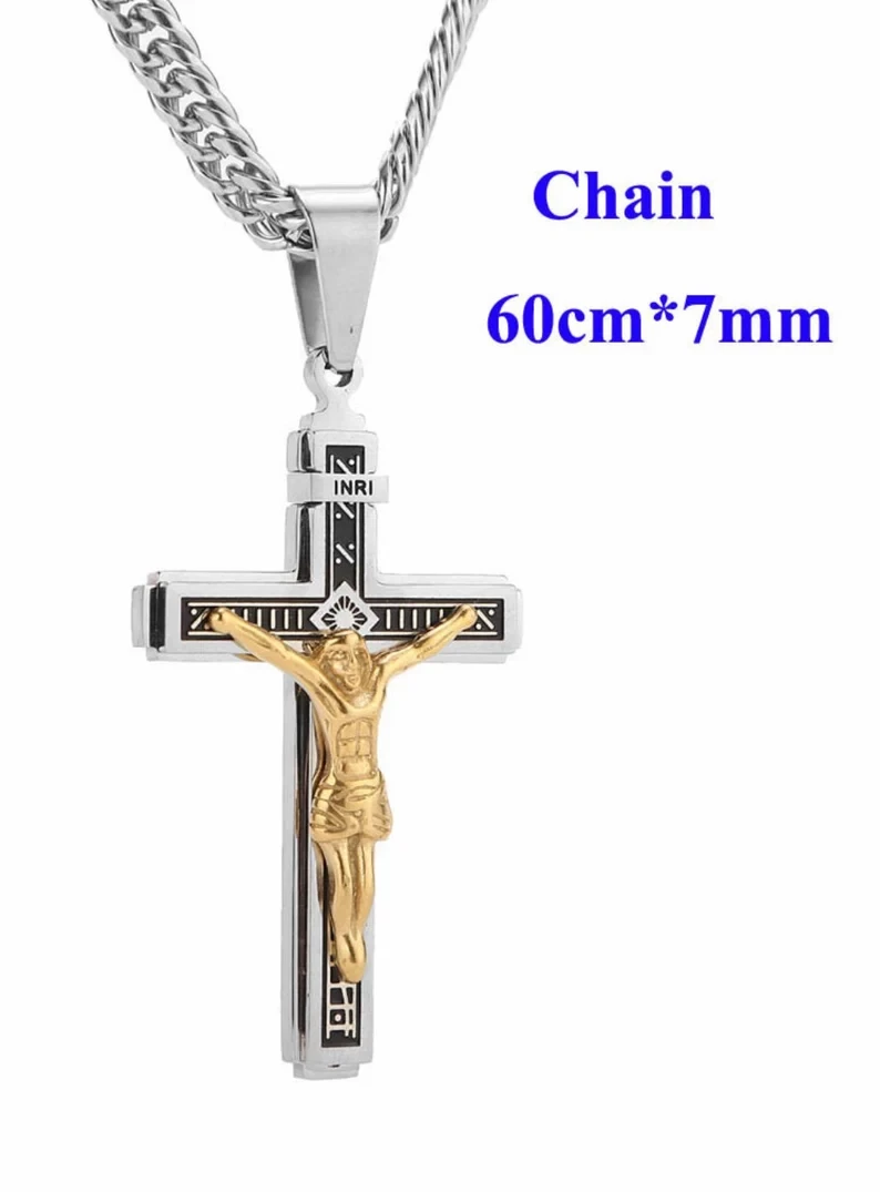 Fabulous looking Heavy Designed Silver, Gold and Black accent 3 color Vintage Stainless Steel Gothic Crucifix Necklace (see the pictures)! All Stainless Steel Waterproof Cross and Chain.