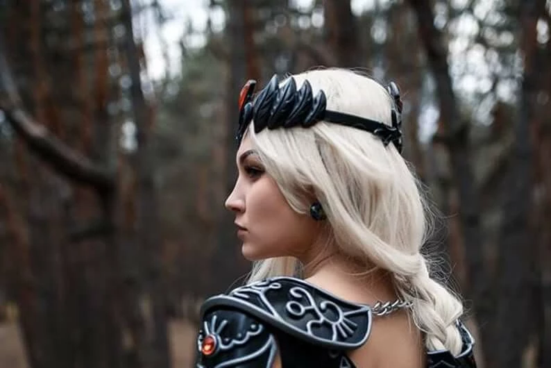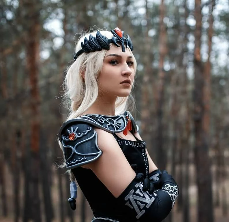– armor pauldrons are poured from injection molding plastic. It is reinforced with a metalized mesh, which allows you to protect the finished product from mechanical damage and deformation. In case of accidental damage, the product does not break up into parts. Armor is formed taking into account the features of the female figure. The final assembly is carried out according to the individual standards of the customer. In addition, the forearm is completed with silicone transparent straps for a more comfortable wearing. Decoration in the form of crystals are cast from a solid epoxy resin, which in time does not lose shape, color, does not dim, does not become sticky.