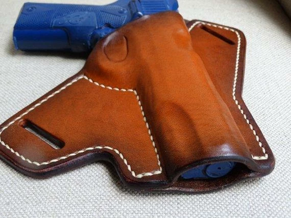 This leather holster accommodates full size 5″ Colt 1911 pistols, and all other full size Colt clones.This piece is made from 8/9oz Hermann-Oak leather making it durable and comfortable to wear. It has been dyed, molded and saddle stitched by hand! This holster was designed to withstand the rigors of everyday carry.