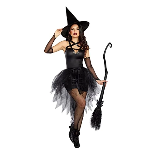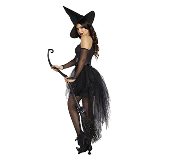 Checkout Women’s wicked witch costume to get a perfect scary look on Halloween party Includes removable, high-low, sparkly tulle skirt, gloves and tall hat made up polyester.