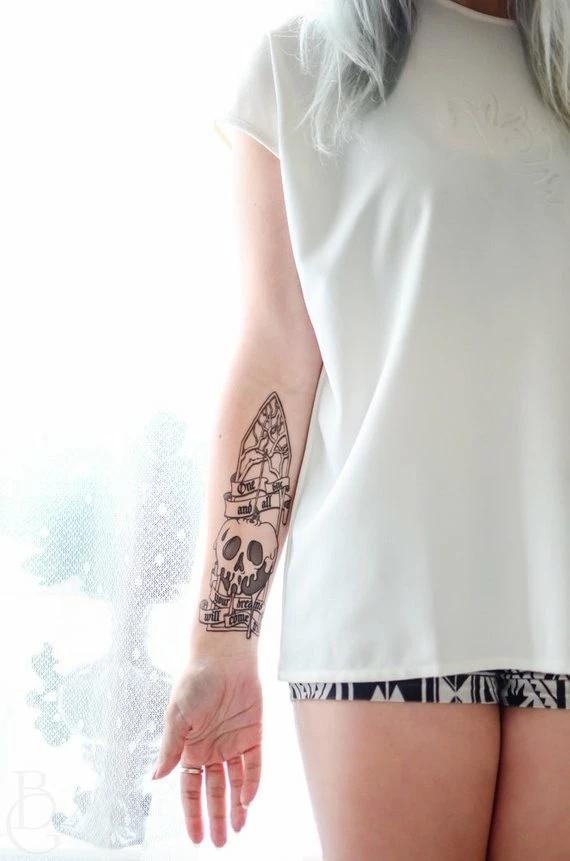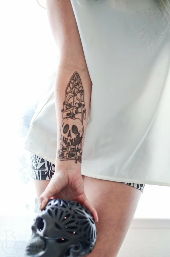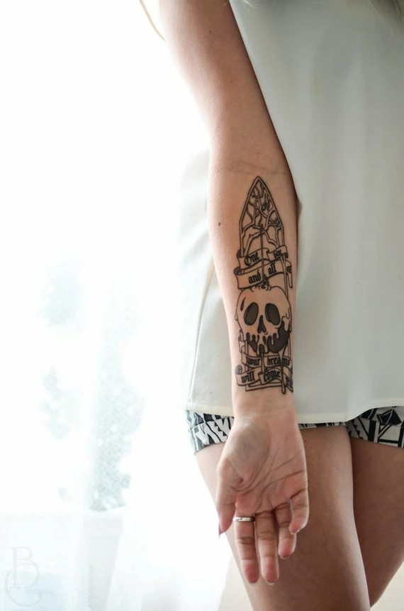 Seekers of beauty, beware! This tattoo design has a forest, apple, and poison elements from the classic tale of Snow White. Bewitch your friends with this elegant-yet-deadly design.