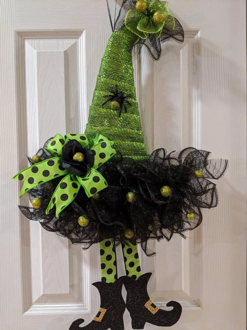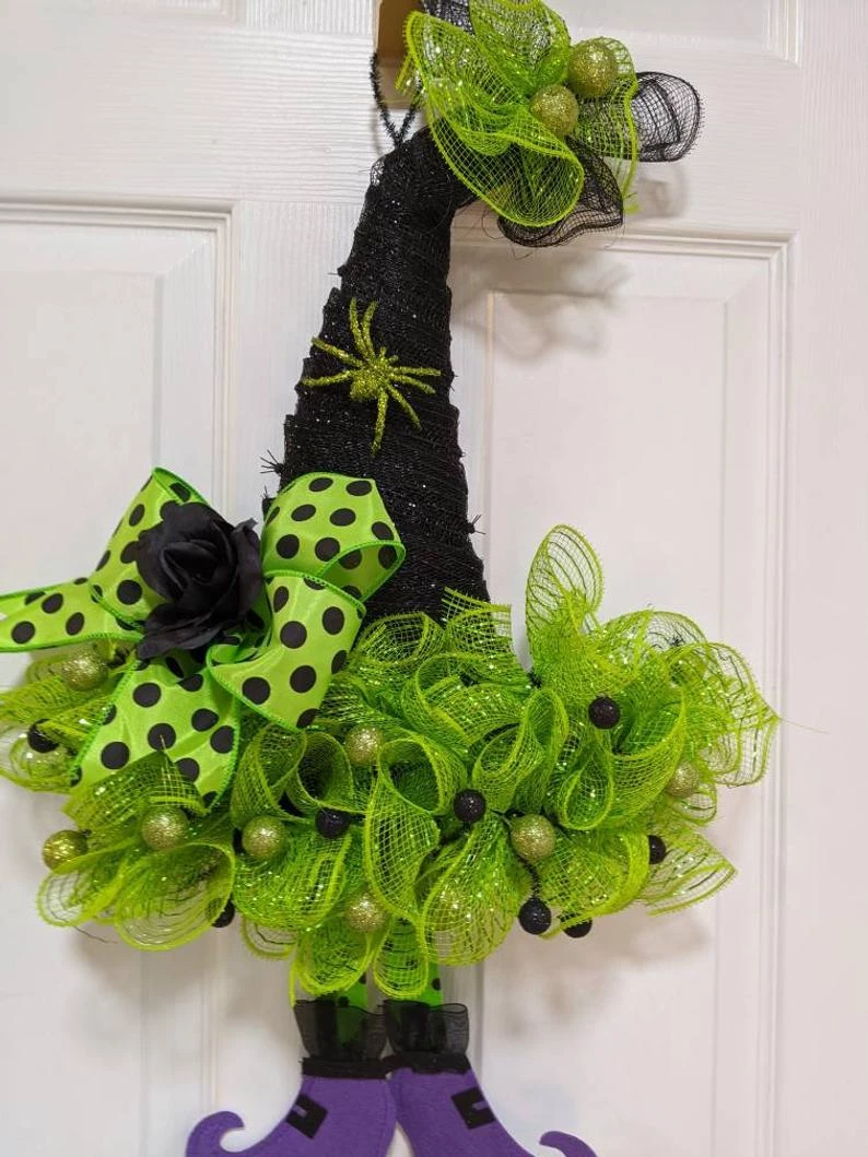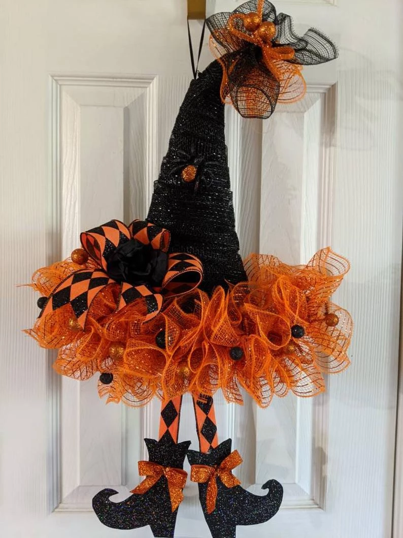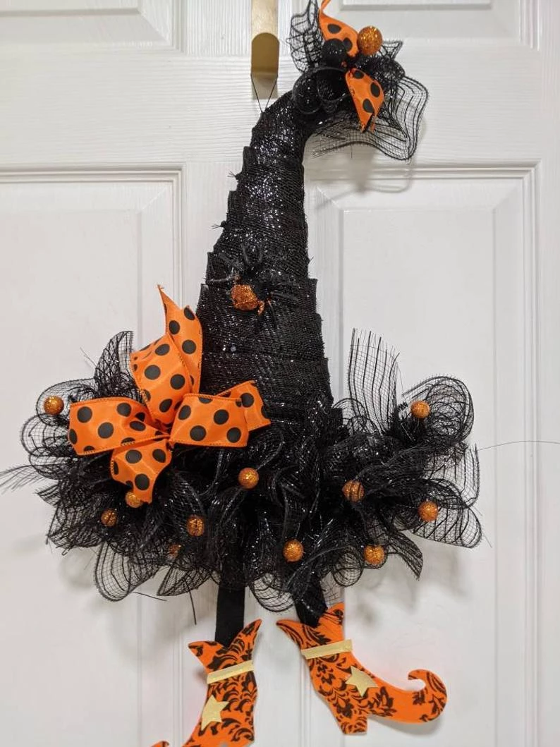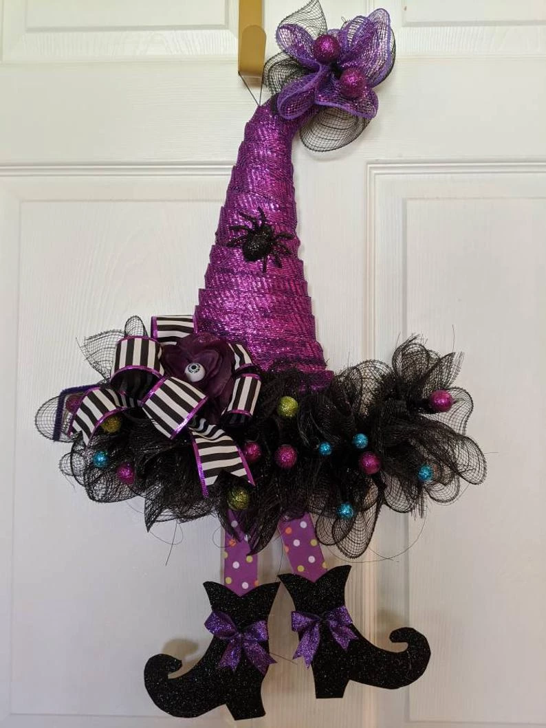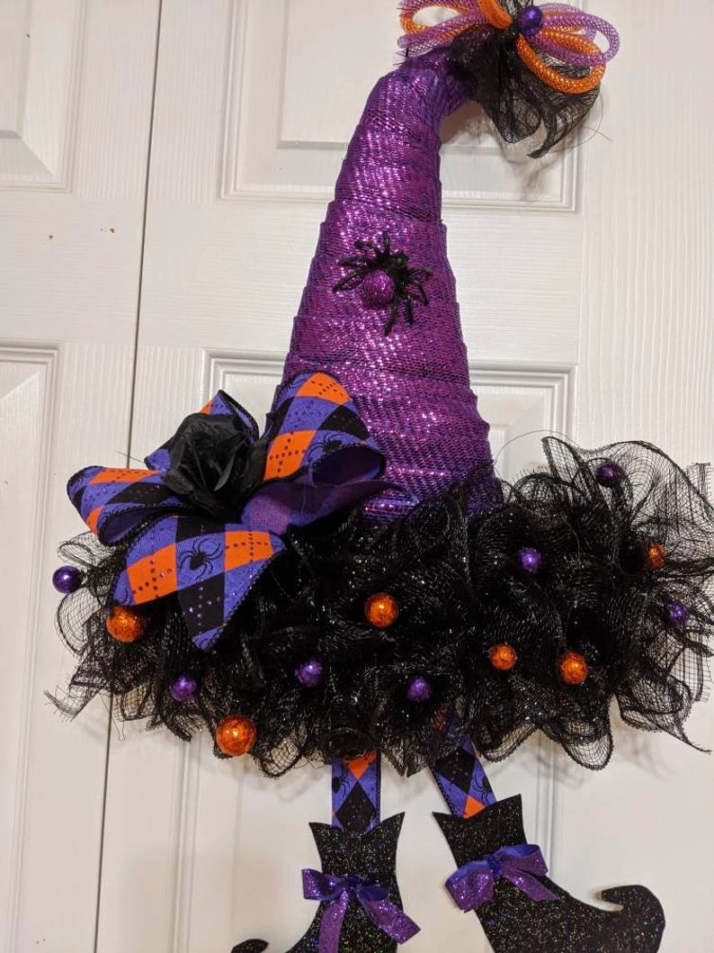 Halloween witch hat wreath with black and orange decor mesh accent ribbons wreath. Measures approximately 24″ in diameter! Beautifully hand made and designed with black and brightly colored Halloween accent ribbon with orange and black accents placed carefully. These hats have so much personality, many colors to choose from. Don’t get caught without your witches hat on..your door that is. 24″ x 16″. Please specify Purple, Orange, Black, green( top of hat color ) See Pictures of what is available. Each hat will be made as close to the color combination in the picture. Or choose a custom combination for an additional fee. I’ve added cute witches feet to all of the hats. Don’t wait to order as they are taking off on their brooms to their new homes. Packed full of ribbons for this Halloween wreath!
