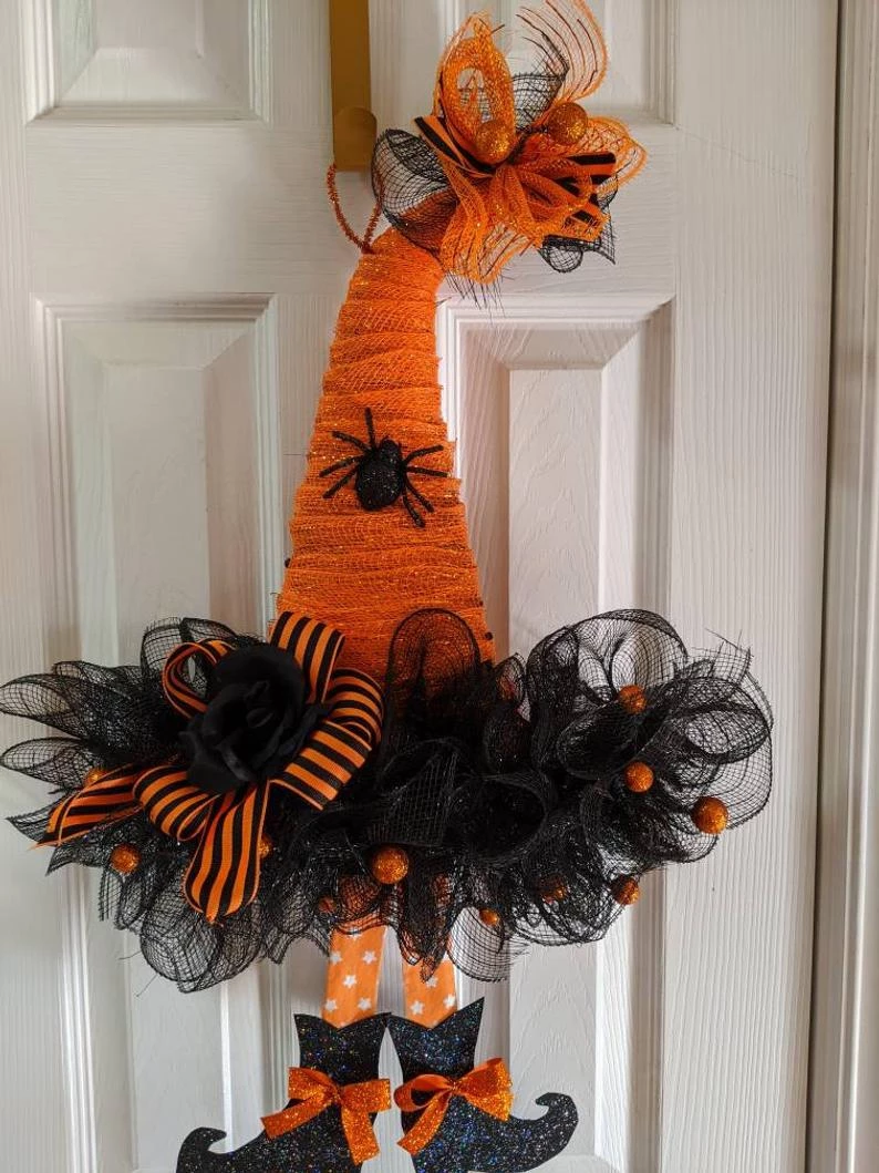 Witch Hat Wreath Halloween Wreath 24″ Black and Orange Ribbon Glittery Witch Hat Glittery Spiders Halloween Wreath Halloween