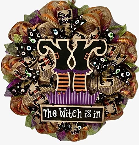 Halloween creamy burlap with metallic orange stripes around the outer ring. Measures approximately 24″ in diameter. FMetallic purple and lime green mesh ribbons are added for color and fullness. The inner ring is made of natural burlap deco mesh and has black ribbons with colorful eyeball ribbons and adorable witch leg ribbons. The center of the wreath has a large wood cut out sign which says “The Witch is In.” It is decorated with adorable, upside down, witch shoes and striped stockings. A corrugated, purple metal witch skirt hangs below the stockings. Great Halloween decoration for doors, windows or walls. The size is 24 inch diameter and 6 inches deep. Please see photo for size comparison.