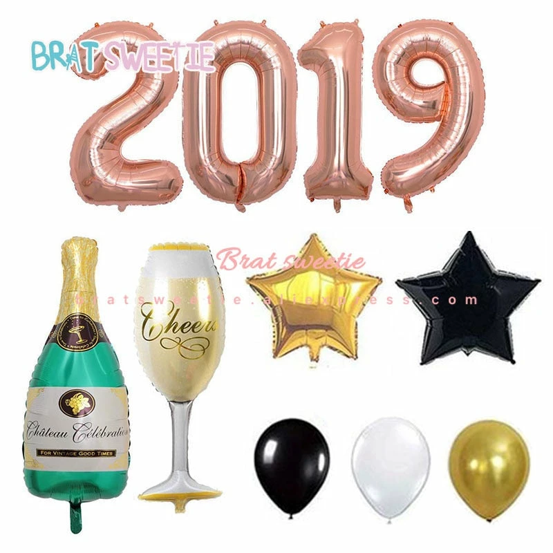 The American Store Happy New Year 2019 Number Letter Foil Balloons Champagne Wine Glass Cup Gold Pink Xmas Eve Party Supplies Helium Balon Set New Year Collection
