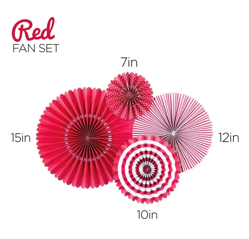 Create the most stunning party setting with these glam party fans! They come in a set of 4, in your choice of color scheme, with different dimensions they are made from red and white paper, origami-style. The set features dotted, plain, and striped pinwheel style. These bright and bold rosettes are reusable and stylish decorations that can be used for any occasion, these fans will add a pop of color to any party! Create a stylish setup by hanging these double-sided rosettes above the treat table, hung by the entrance, in the garden for a bbq birthday, or by creating a statement backdrop! For an even more stunning soiree, pair it with one or more of our other garlands & banners for a flawless party decoration.