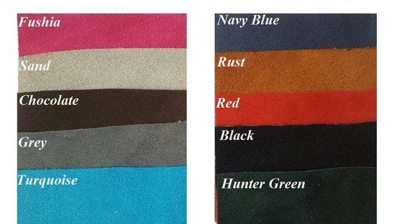 – Suede Color: Black, Sand, Red, Pink, Turquoise, Rust, Grey, Chocolate, Hunter Green, or Navy Blue