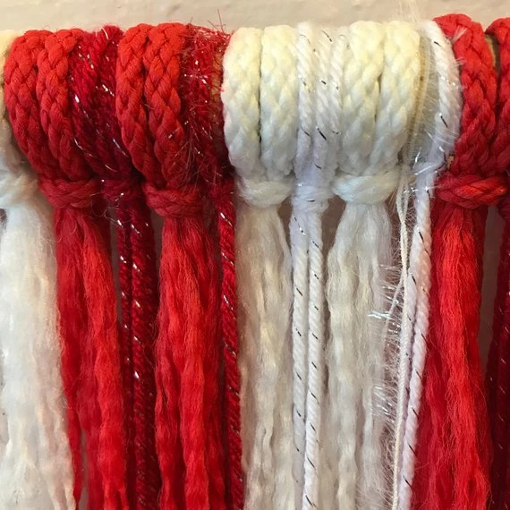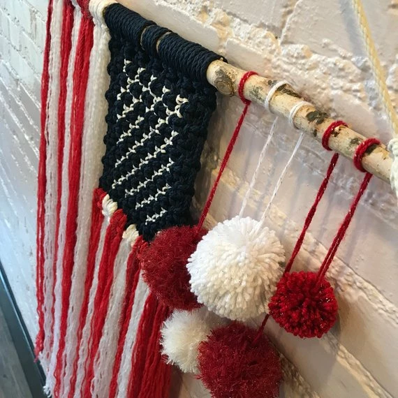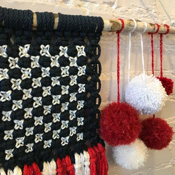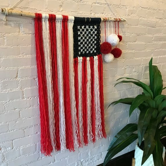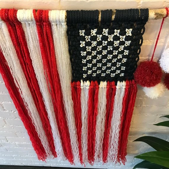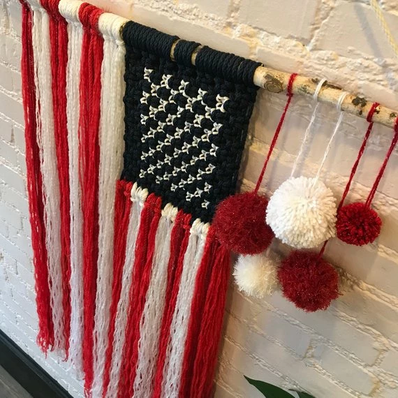 This patriotic American flag macrame is made with 100% cotton 6mm ropes in red, white and blue. I’ve also added sparkly yarns in various colors and textures. The “bombs bursting in air” (poms) are sparkly yarns that the camera just cannot do justice to. This wall hanging measures 37” long x 27” wide. The stick is 37” wide.
