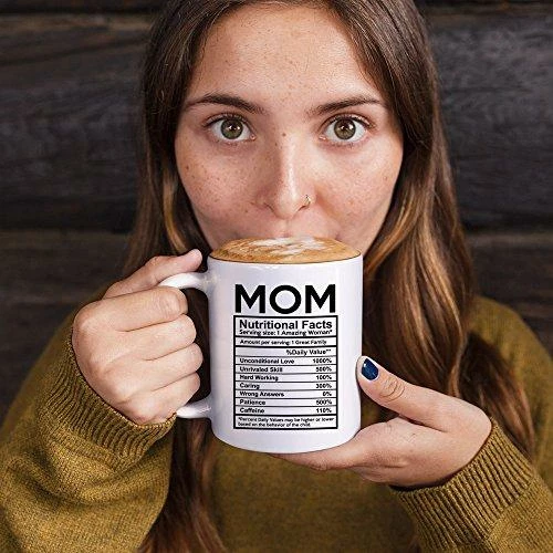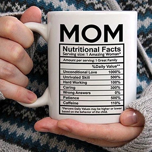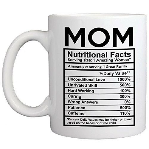 - ARRIVES 100% READY TO BE GIFTED – Mom Nutritional Facts Label 11oz cup is dishwasher and microwave safe. Packaged perfectly and ready to wrap for a present. Perfect gift idea for mothers with long distance relationships with daughters, sons, kids.