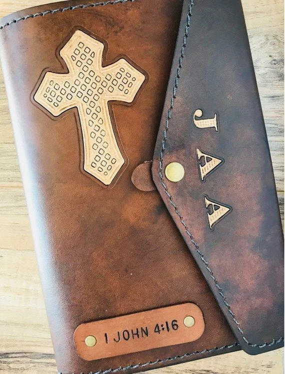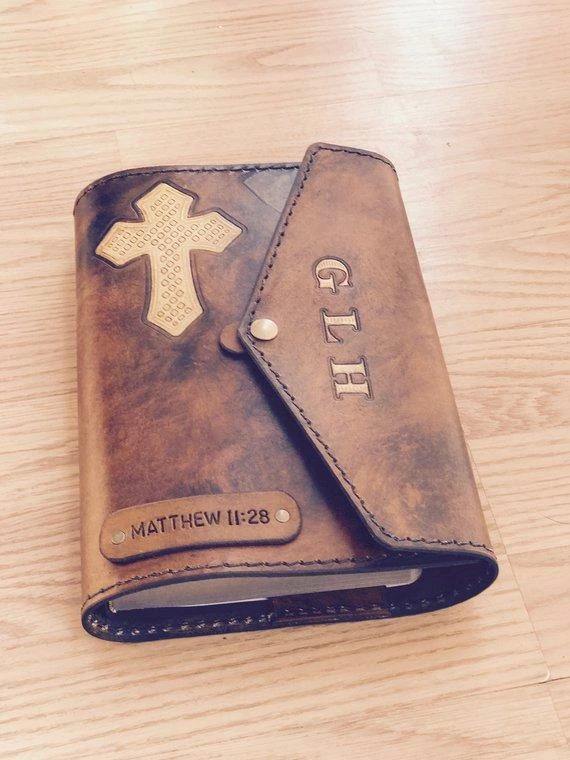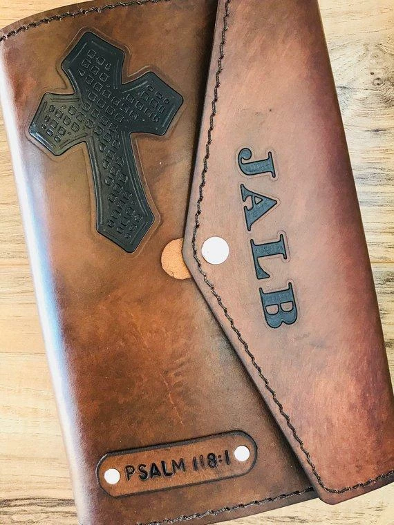 – Our custom leather scripture covers are made out of 100% full grain leather. They are handcrafted in the USA. They are uniquely designed with a custom fit for the King James Bible that comes included. Our cases are truly unique, and exquisitely crafted with the highest quality. 100% satisfaction guaranteed. The Bible is included in this listing unless you request a custom fit for an existing Bible or book. If you want the leather cover for an existing bible please provide us with the height, width, and thickness of the Bible in the notes to seller at checkout.