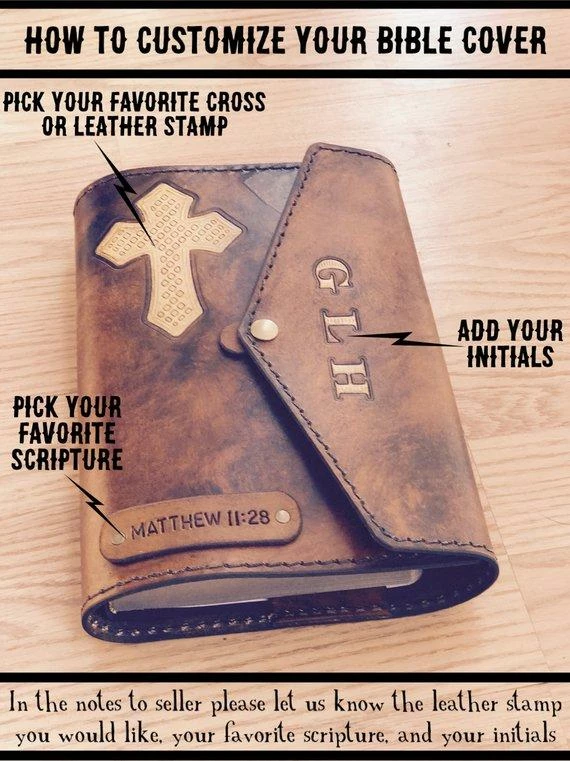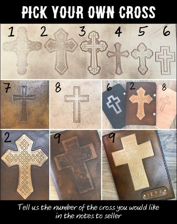 1. Pick between a variety of patriotic and Christian leather stamps to be embossed on your custom leather scripture cover. Look at the last two photos to pick which stamps you want embossed on the front or back of your cover and tell us in the notes to seller which stamps you would like and where you would like them.