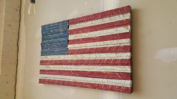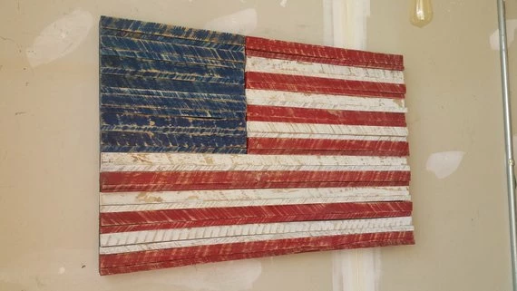 For this beautiful work of art we’ve collected and re-purposed old oak and poplar boards. We cut each board down into small strips and then individually sand and paint each piece. We then assemble them together at varying heights to create a unique wave like effect.