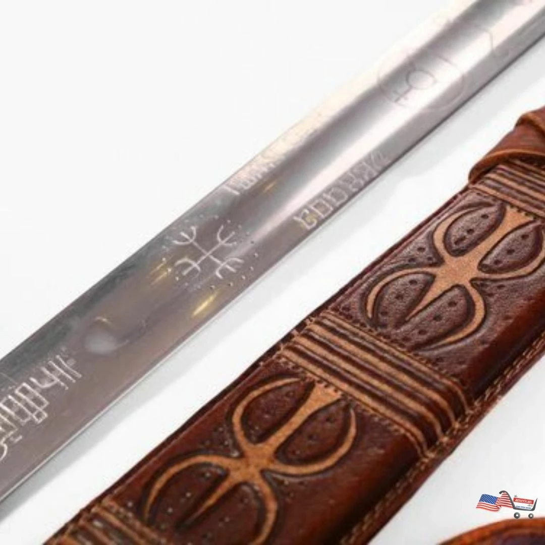 The first master makes a blade of sword using duralumin metal. Then the sword is being sent to another master who makes hande out of wood. Then – it goes to our prop-makers, which attach a 2-wolf pommel made of tin. If you request scabbard – the sword goes to a master who makes a wooden scabbard. After scabbard is made – this goes to another master who wrapped it in genuine leather.
