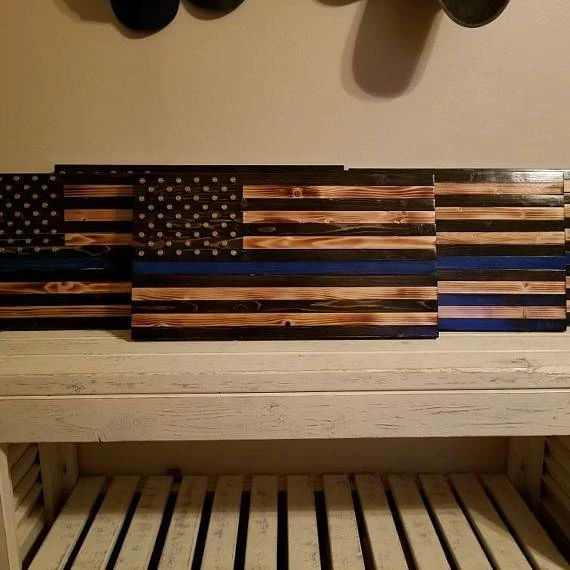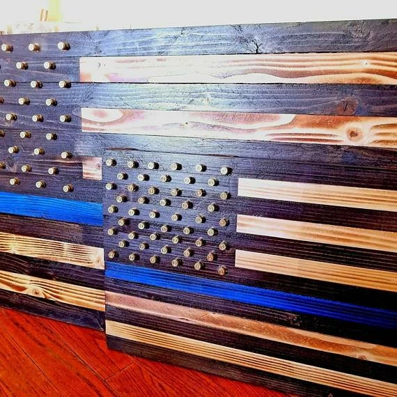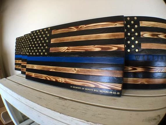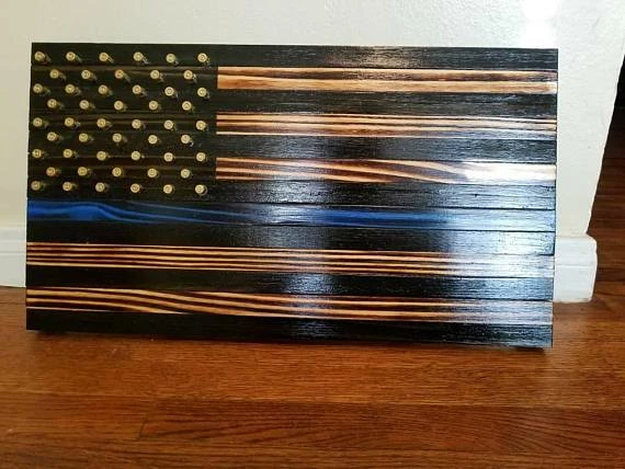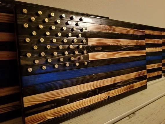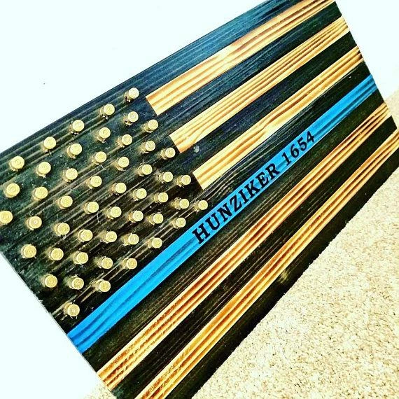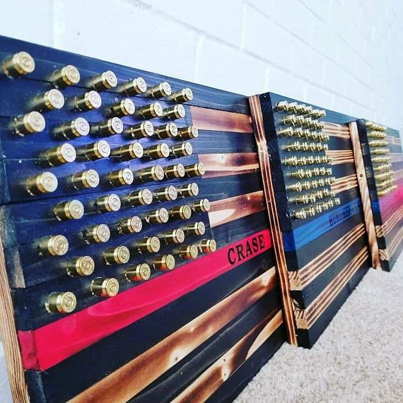 Rustic American flag with black and torched stripes, thin blue line and union from ammo casings for stars with optional last name cut from vinyl.