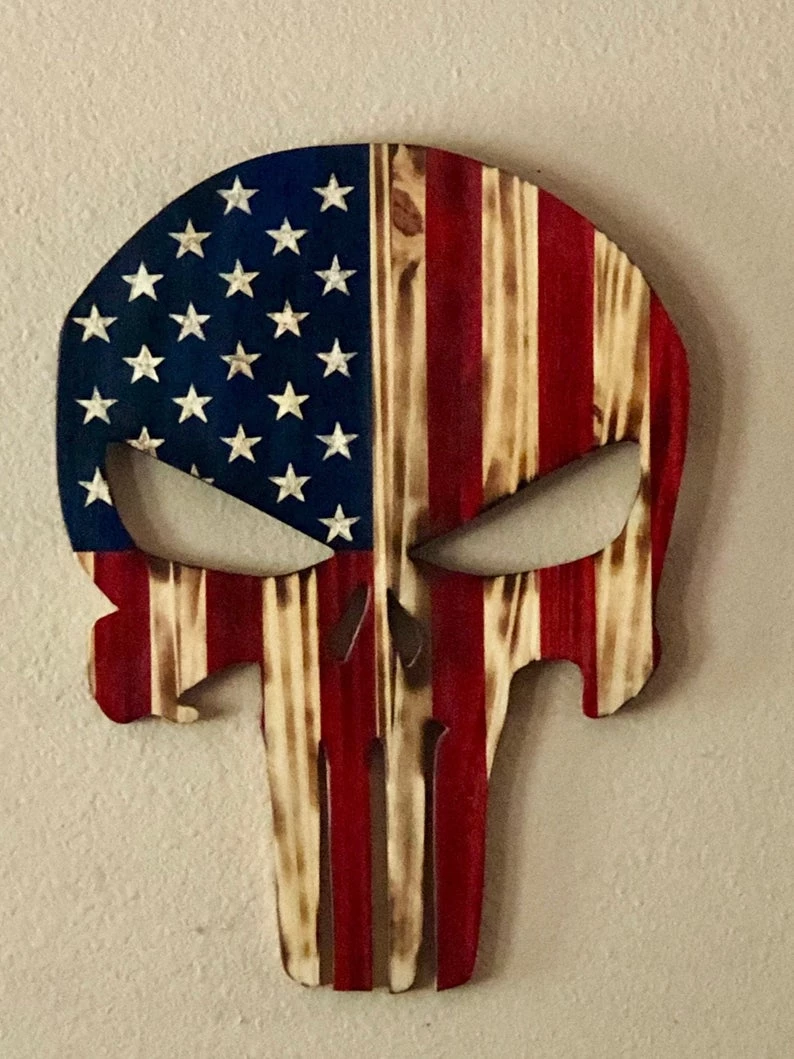 These Punisher Skulls are wood burned, hand carved(dremel tool) hand painted, and hand cut. They are made out of distressed pine wood.